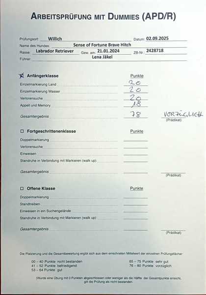 Bei einer Aufgabe hat Greta das Dummy sehr weichmäulig getragen und durch ihre Geschwindigkeit fiel es einmal fast zu Boden. Sie fasste nach und rannte sofort weiter zu mir. Leider kostete uns dies 6 Punke. Schade - aber so was kann passieren. Trotzdem erreichten wir einen tollen 9. Platz und ein sehr gut. Wie immer bin ich sehr stolz auf meine Magarete.