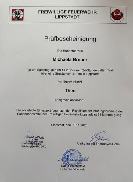 Heute besteht Theo aus unserem A-Wurf die Mantrailer Prüfung bei der Feuerwehr Lippstadt.